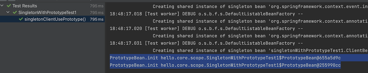 실행해보면 prototypeBeanProvider.getObject() 을 통해서 항상 새로운 프로토타입 빈이 생성되는 것을 확인할 수 있습니다.