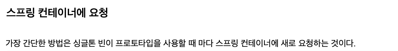 이렇게 해서 우리가 프로토타입 빈을 사용할 때마다 스프링 컨테이너에 요청해서 그때그때 생성을 해서 사용한다는 요구사항에 맞았습니다.