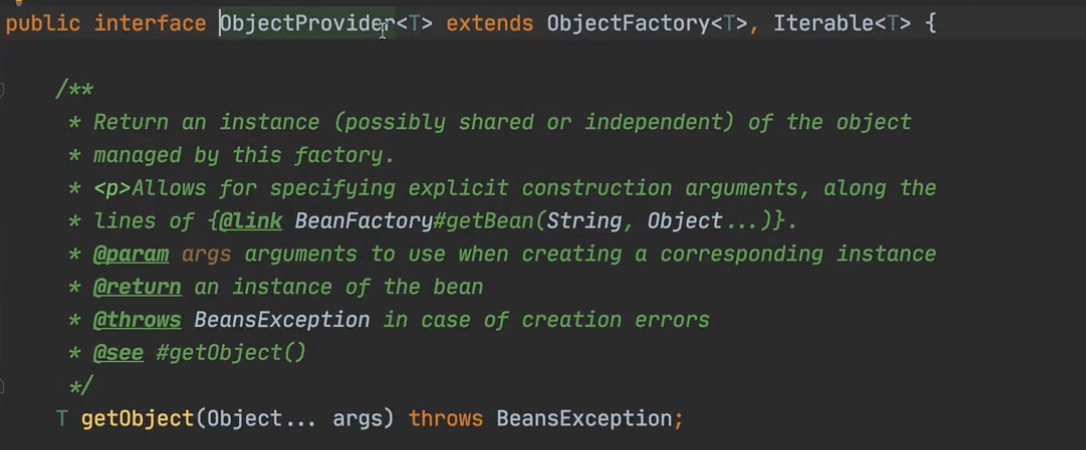 ObjectProvider 입니다. ObjectProvider는 인터페이스인데 ObjectFactory를 상속받고 있죠. ObjectProvider가 ObjectFactory 보다 더 많은 편의 기능을 제공합니다.