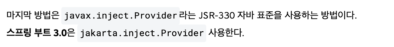 JSR-330 Provider이라는 건데요. JSR - xxx는 다 java 표준이라고 했죠. java에서 표준으로 정한 거예요. 이렇게 뭔가를 컨테이너에서 가져올 때, Provider 개념을 자바 진영에서 표준화한 거예요.