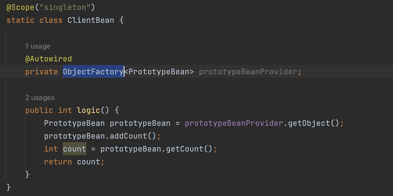 그런데 핵심이 프로토타입을 쓰는 게 핵심이 아니예요. 이 ObjectProvider는 스프링 컨테이너를 통해서 Dependecy Lookup, 즉 찾아주는 과정을 조금 더 간단하게 도와주는 거예요.