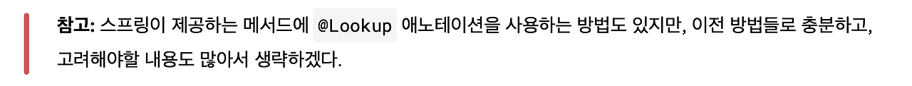 그리고 참고로 스프링이 제공하는 메서드에 @Lookup 애노테이션을 사용하는 방법도 있어요. 그런데 이거는 이전 방법들로 충분하고, 고려해야할 내용도 많아서 생략하겠습니다.