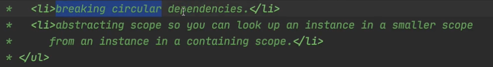 A는 의존관계 주입할 때 B가 당장 필요하지만, B가 A를 필요해하는 시점은 나중이잖아요. 실제 사용하는 시점은 뒤로 밀리기 때문에, Provider를 쓰면 이 순환 참조에 문제가 발생하지 않아요.