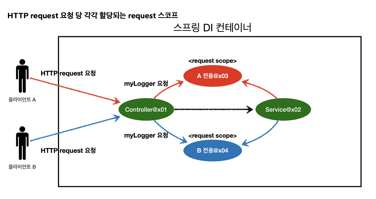 왜냐하면 클라이언트 A의 request 요청과 클라이언트 B의 request 요청에 맞춰서, 각각 다른 스프링 빈이 생성이 돼서 사용됩니다.