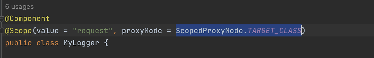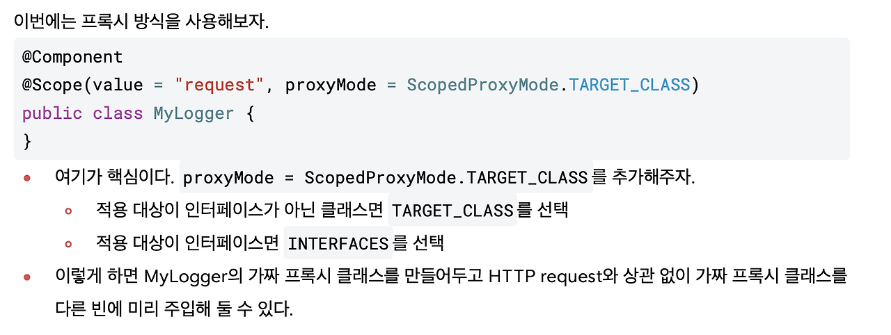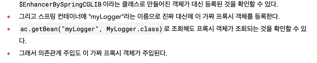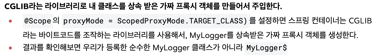 이렇게 하면 MyLogger의 가짜 프록시 클래스를 만들어서 주입시켜줘요. 진짜가 아닌 가짜를 주입해줘요. HTTP request와 상관 없이, 그러니까 생존 범위 상관없이 가짜 프록시 클래스를 다른 빈에 미리 주입해둘 수 있습니다.