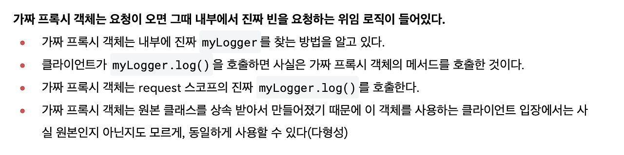 그래서 가짜 프록시 객체는 내부에 진짜 myLogger를 찾는 방법을 알고 있어요.