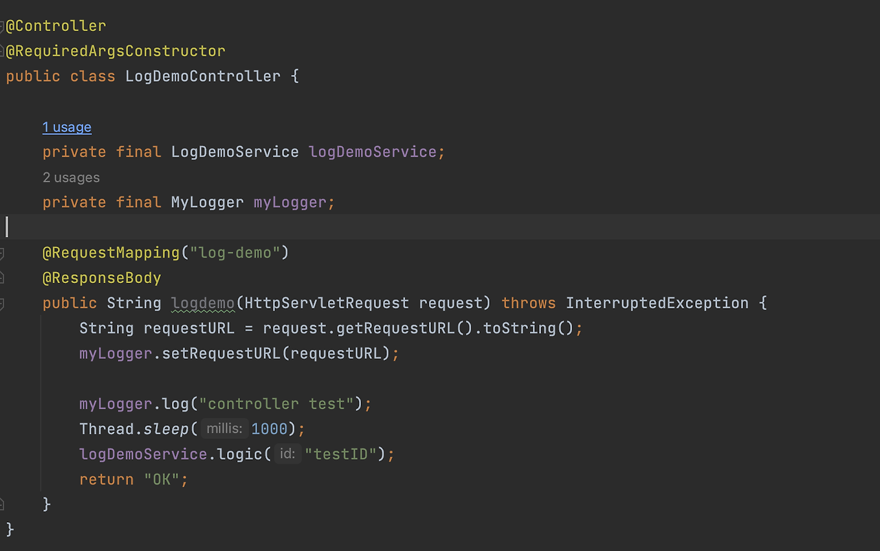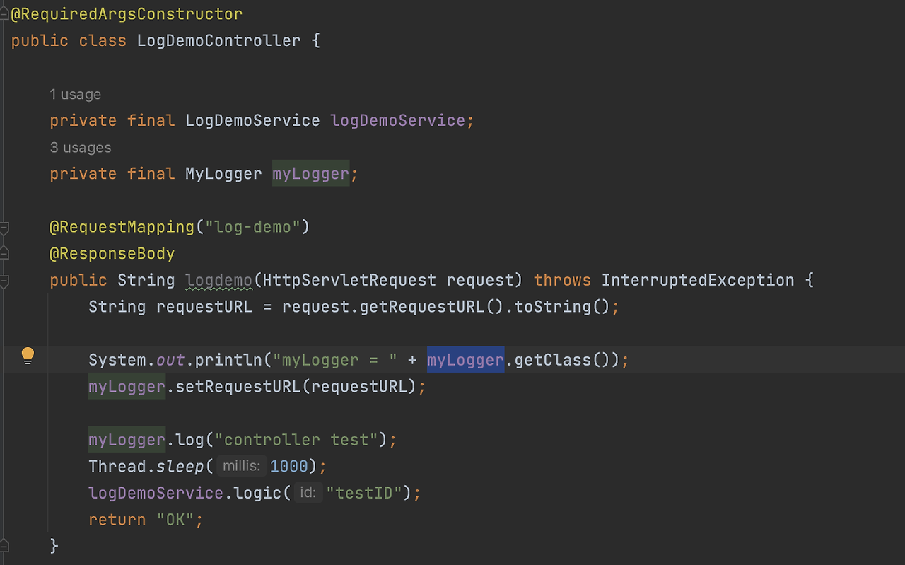 미리 주입해두고 localhost:8080/log-demo로 HTTP 요청이 들어오면, 바로 사용하는 거죠.