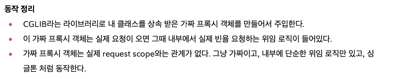 CGLIB라는 라이브러리로 내 클래스를 상속 받은 가짜 프록시 객체를 만들어서 주입해준다고 이해하면 되고, 어쨌든 가짜이기 때문에 가짜는 request scope 이런게 필요가 없어요. 그냥 마치 싱글톤처럼 되는 거예요. 가짜이기 때문에 다 같이 공유해도 되고 그냥 껍데기만 있는거죠.