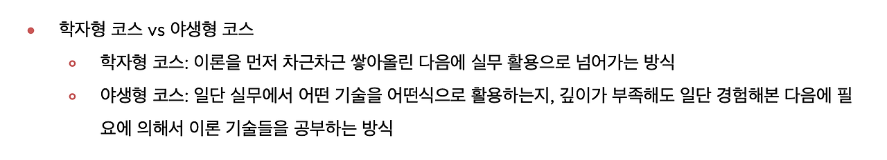 그런데 야생형은 실무에서 어떤 기술이 어떤 식으로 활용이 되는지, 깊이가 부족해도 일단 경험을 해봐요. '아 코드가 이렇게 돌아가는구나, 내가 이게 부족하구나' 하고 찾아요. 그 다음에 필요에 의해서 이론 기술들을 공부하는 방식입니다. '아 지금 내가 실무에서 이걸 하려면 이게 필요하구나' 이런 거죠.