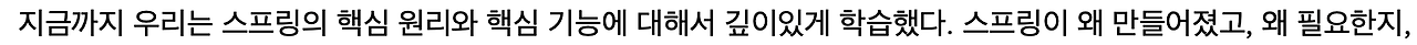 그래서 지금까지 우리는 스프링의 핵심 원리와 핵심 기능에 대해서 깊이있게 학습을 했습니다.