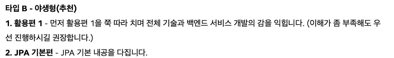 그리고 또는 여러분들이 야생형 코스를 학습하는 도중에 '아 나는 도저히 기본 원리를 어느 정도 배워야 올라올 수 있겠어' 라고 하면, 이 활용 1편까지 하시고 그 다음에 스프링 기본 기술을 학습하신 다음에 올라오셔도 돼요.