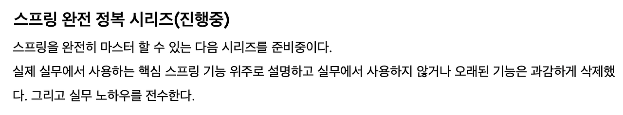 스프링을 완전히 마스터할 수 있는 시리즈를 계속 준비를 하고 있고요. 실제 실무에서 사용하는 핵심 스프링 기능 위주로 설명을 하고 실무에서 사용하지 않거나 오래된 기능들은 과감하게 삭제를 할 거에요.