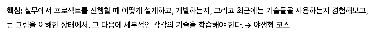 핵심은 실무에서 프로젝트를 진행할 때 어떻게 설계하고 개발하는지, 그리고 최근에 사용되는 기술들을 경험해보고 큰 그림을 이해한 상태에서, 그 다음에 세부적인 각각의 기술들을 이제 학습해야 됩니다. 이게 야생형 코스인데요.