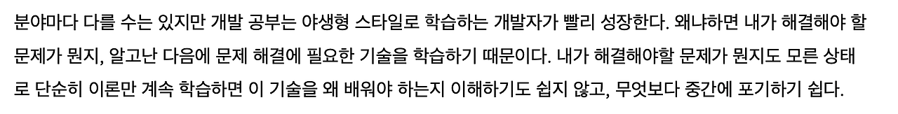 어쨌든 필요한 부분만 찾아서 하기 때문에 개발 공부는 야생형 스타일로 학습하는 개발자가 빨리 성장한다고 생각을 해요.