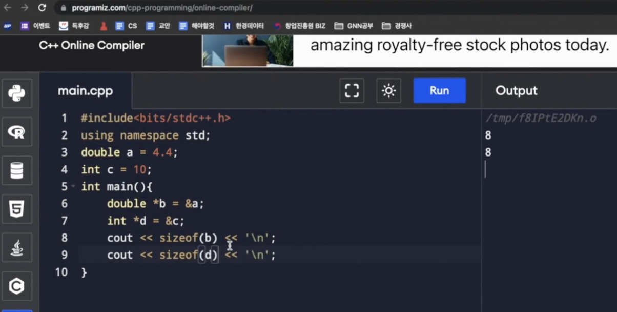 programiz를 운영하는 내부 서버 자체가 64bit이기 때문에 8바이트로 통일돼서 나오는 거다.