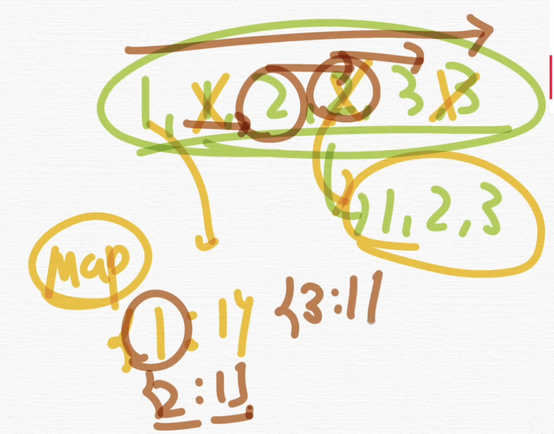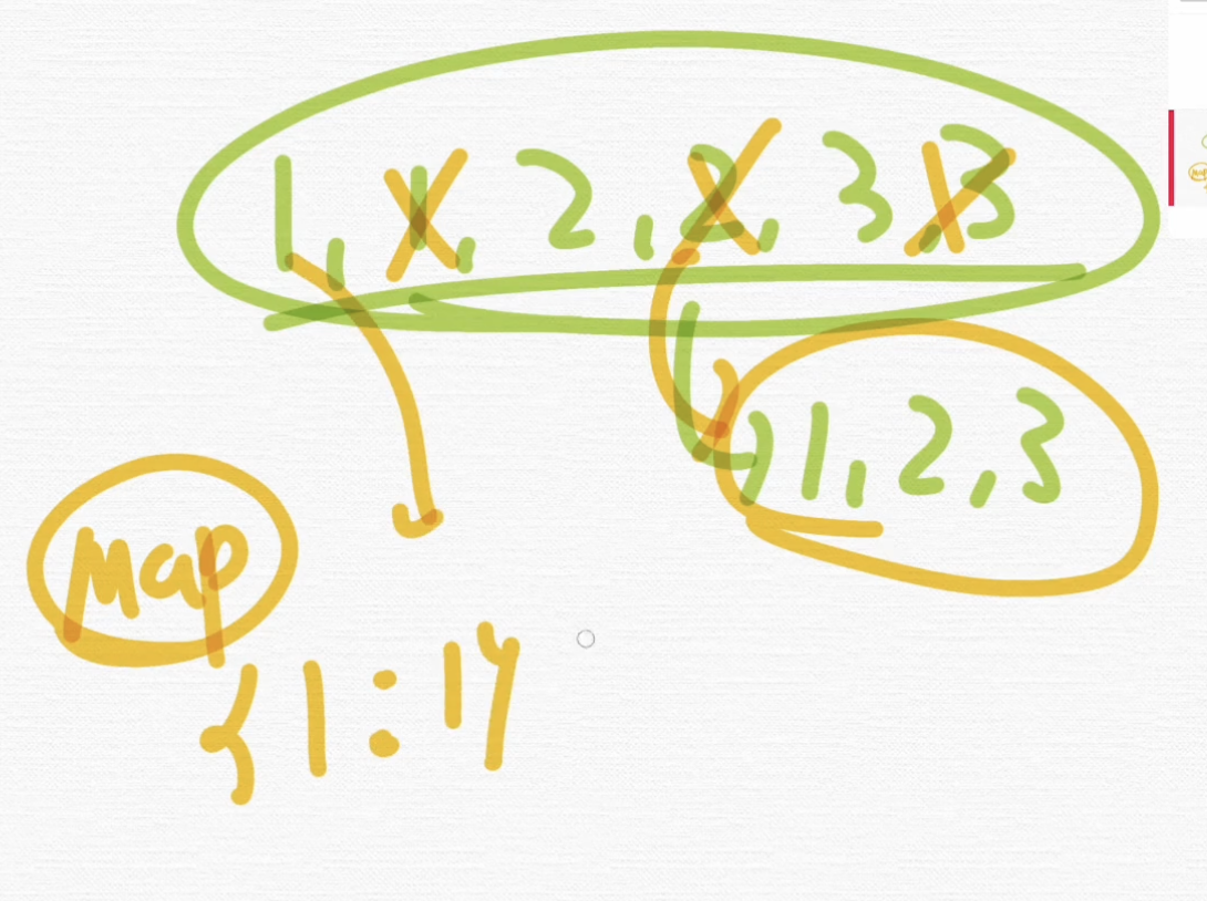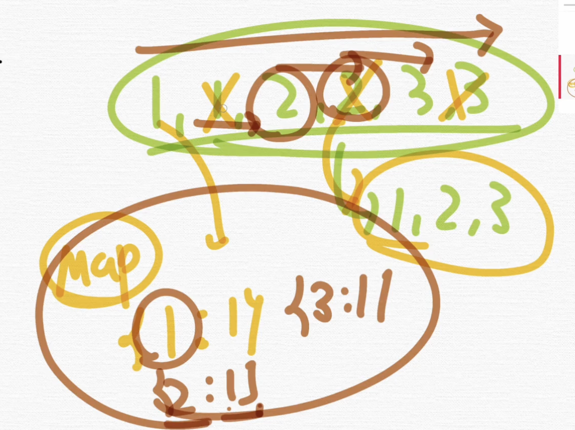 그래서 1이라는 Key의 어떤 Value가 있어요. 그럼 continue. 그 다음에 원소 2가 들어오고, 2라는 Key에 아직 value가 없으니까 값을 할당하겠죠. 그리고 그 다음 원소인 2를 보고, 2라는 Key에 값이 이미 있으니까 넘어갈 겁니다. 그 다음에 3이 오네? 그럼 3에다가 값 할당, 이런 식으로 하는 방법이 있습니다.
