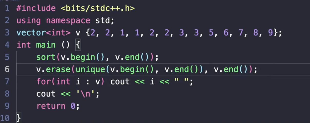 unique()는 정말 단순하게, 앞에서부터 중복되는 거를 찾아가지고 하나로 없애는 거예요. 얘한테는 이 원소가 앞에 또 나왔던 것인지, 뒤에 또 나올 것인지는 중요하지 않습니다.