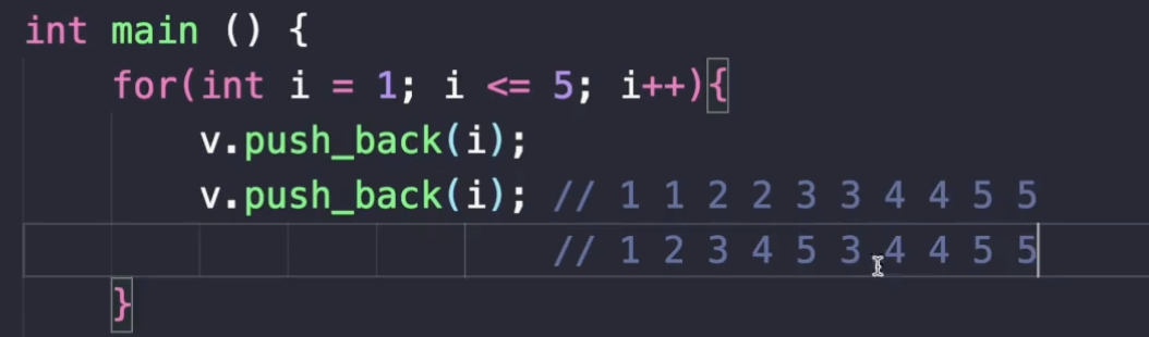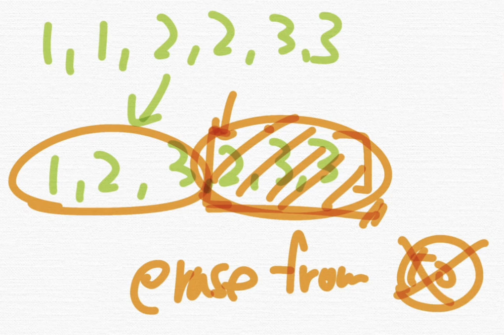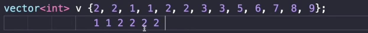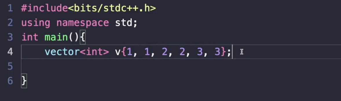 일단 vector를 {1, 1, 2, 2, 3, 3}으로 선언했습니다. 여기서 중복된 요소를 끄집어 낼 거예요.