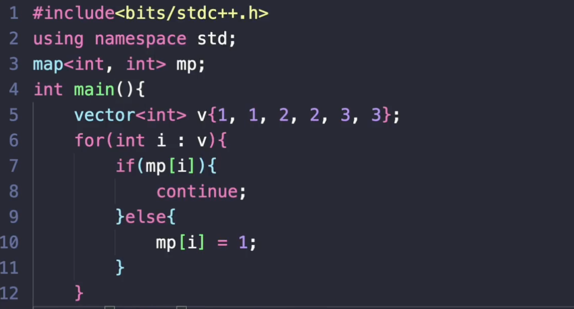 순회를 하면서, 만약에 mp[i]에 값이 있다면, 즉 i 라는 Key 값에 할당된 Value가 있다면, continue; 를 하고, 없다면 mp[i]에 1을 할당해줍니다.