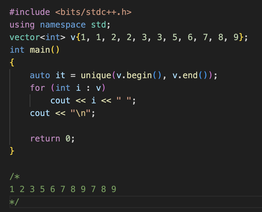 unique는 범위안의 있는 요소 중 앞에서부터 서로를 비교해가며 중복되는 요소를 제거하고 나머지 요소들은 삭제하지 않고 그대로 두는 함수입니다. 그리고 O(n)의 시간복잡도를 가집니다.